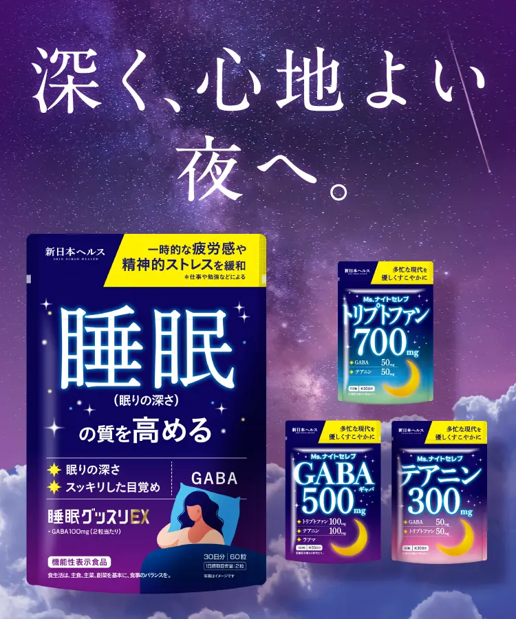 トリプトファンをたっぷり700mg、GABA50mg、テアニン50mg配合。3つのリラックス成分で頑張るあなたの休息をサポートするサプリメントです。