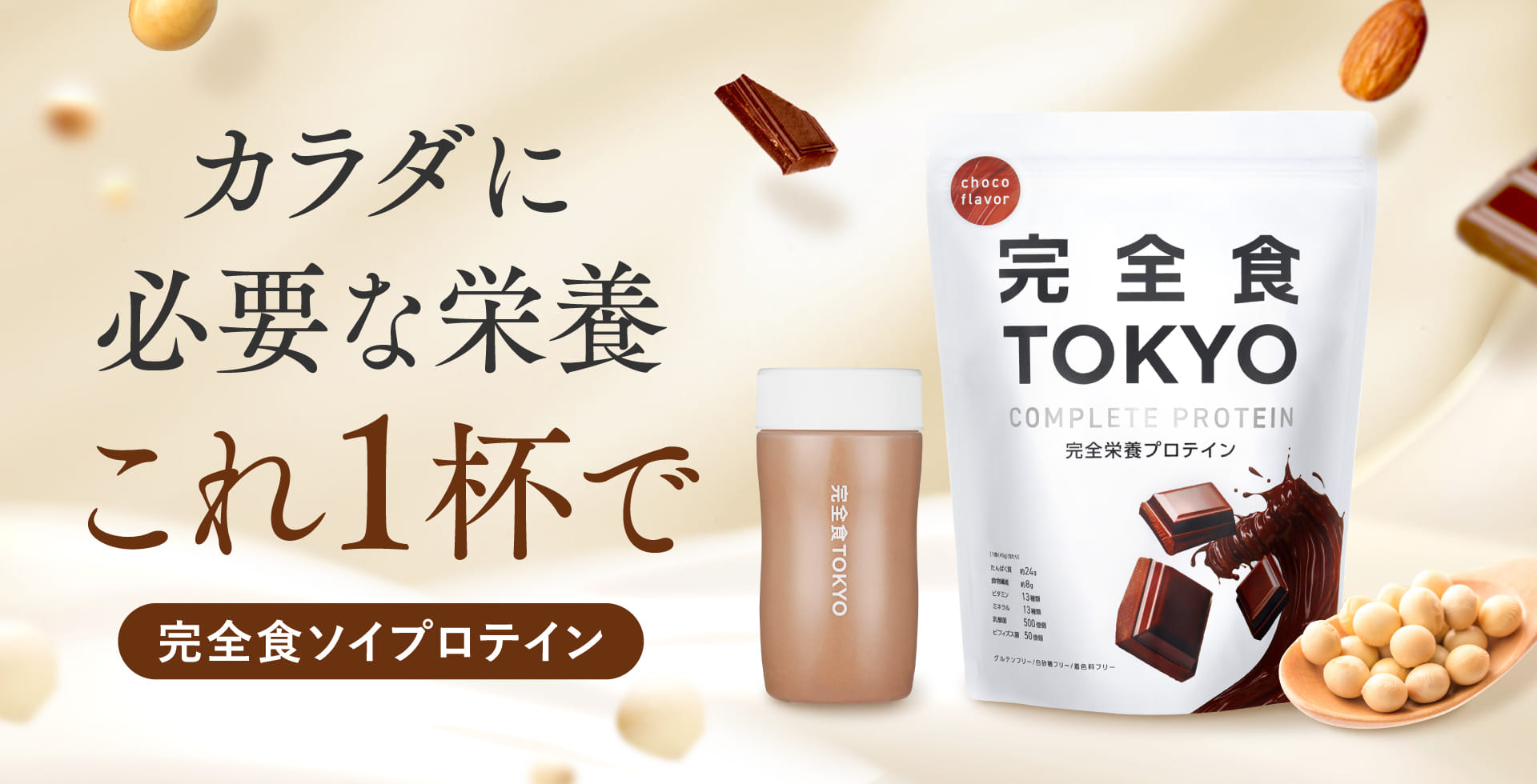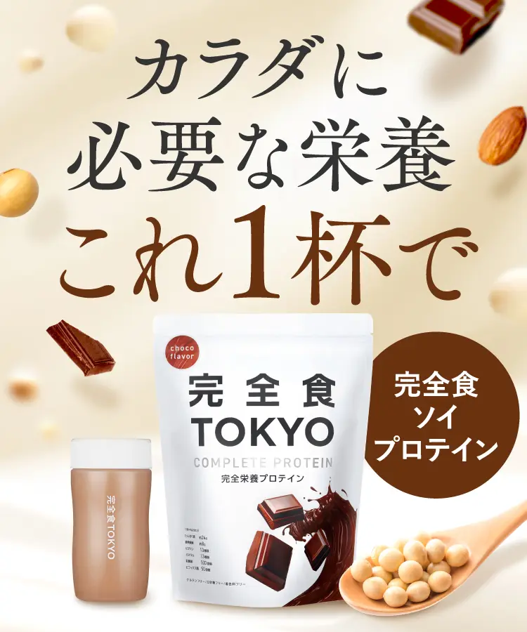 必要な栄養これ1杯で。完全栄養食×ソイプロテインです。1杯飲むだけで、手軽に栄養チャージでき、30種の栄養を補えます。